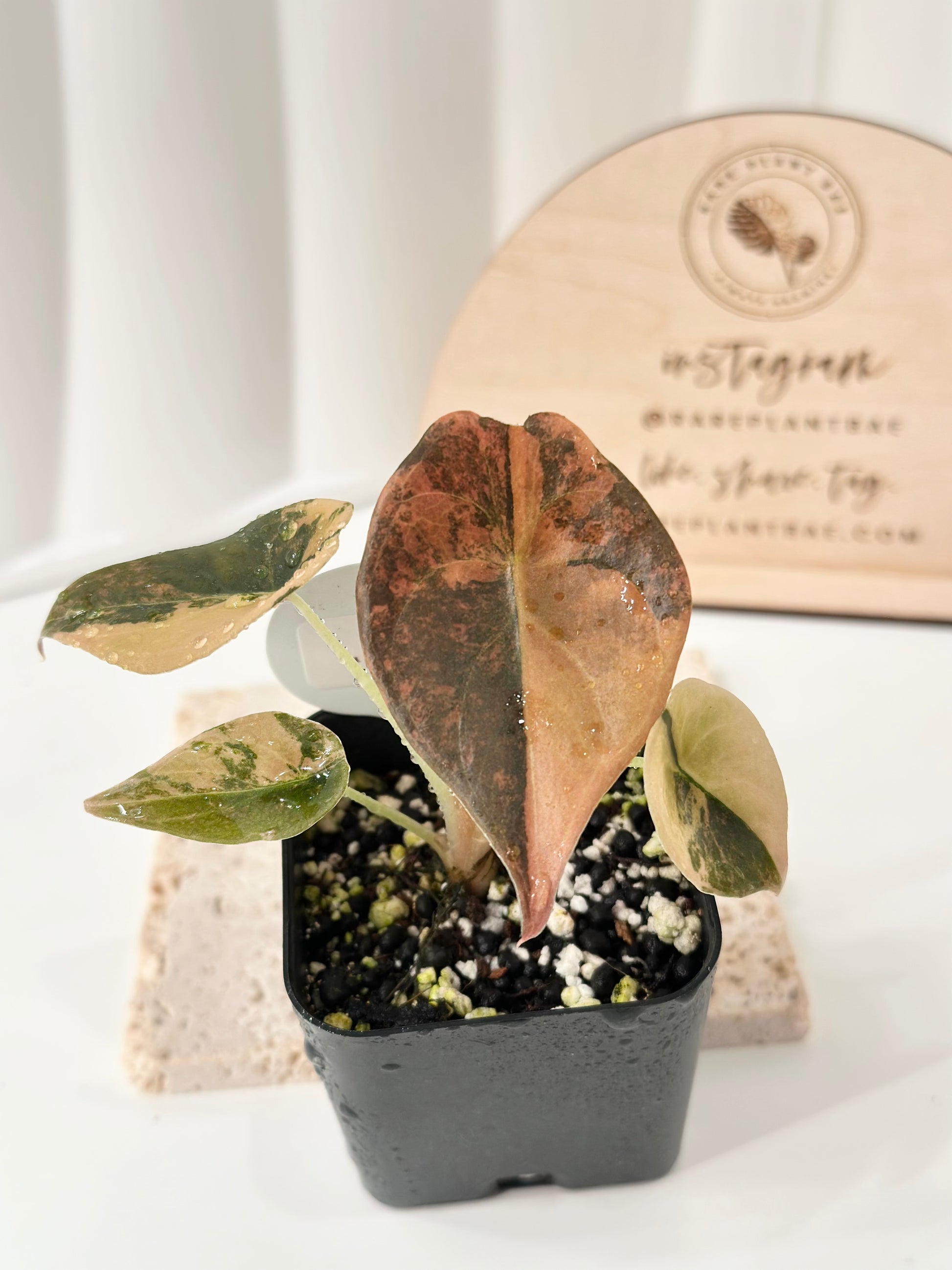 Alocasia Cuprea variegated - "caramel latte"/ aurea is a specific variegation strain that leaves turn into a peachy pink variegation once fully hardened. Only my mother plant Cuprea "caramel latte" Mother Plant and a few other collectors' have that particular strain.