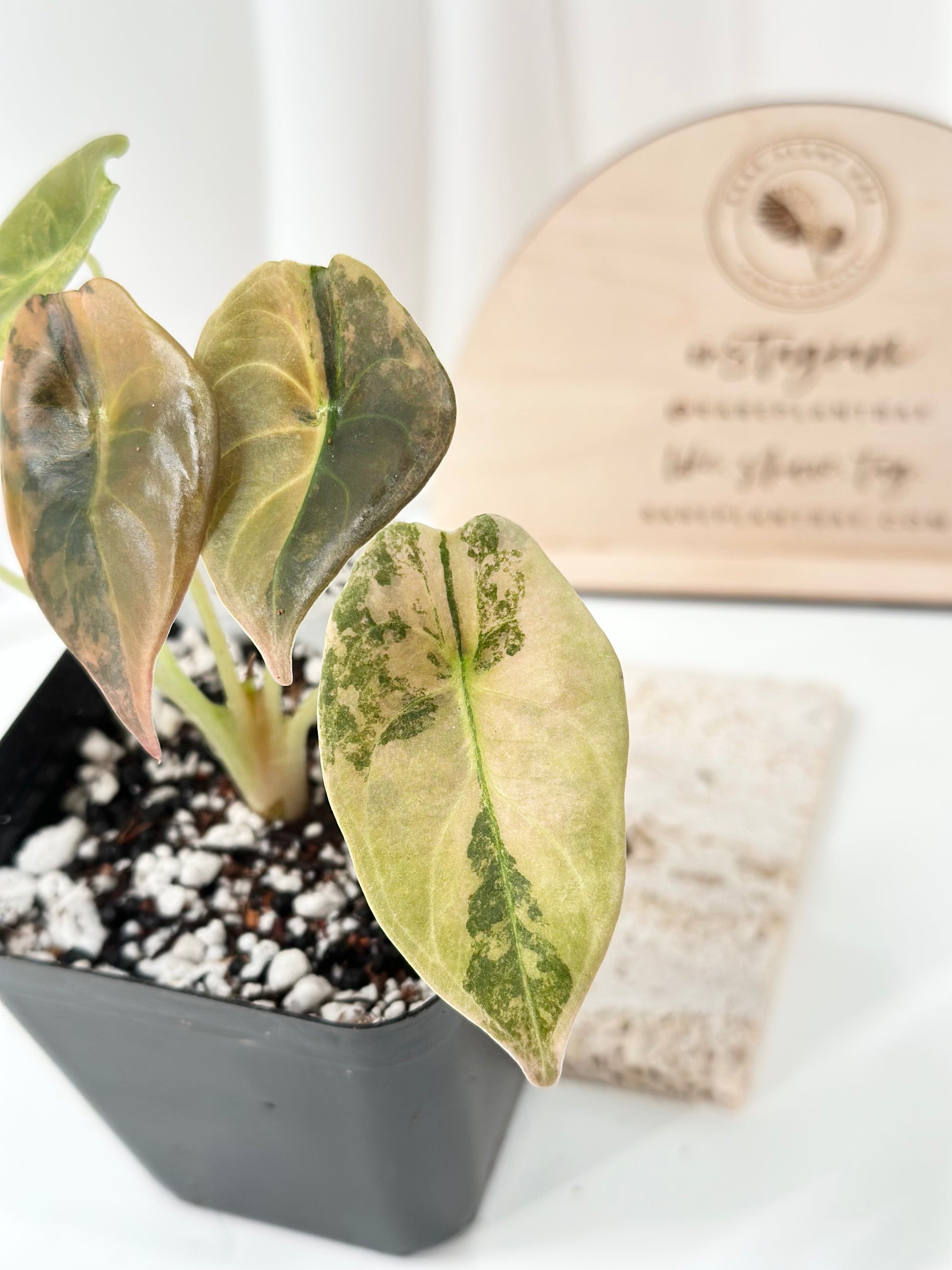 Alocasia Cuprea variegated - "caramel latte"/ aurea is a specific variegation strain that leaves turn into a peachy pink variegation once fully hardened. Only my mother plant Cuprea "caramel latte" Mother Plant and a few other collectors' have that particular strain.