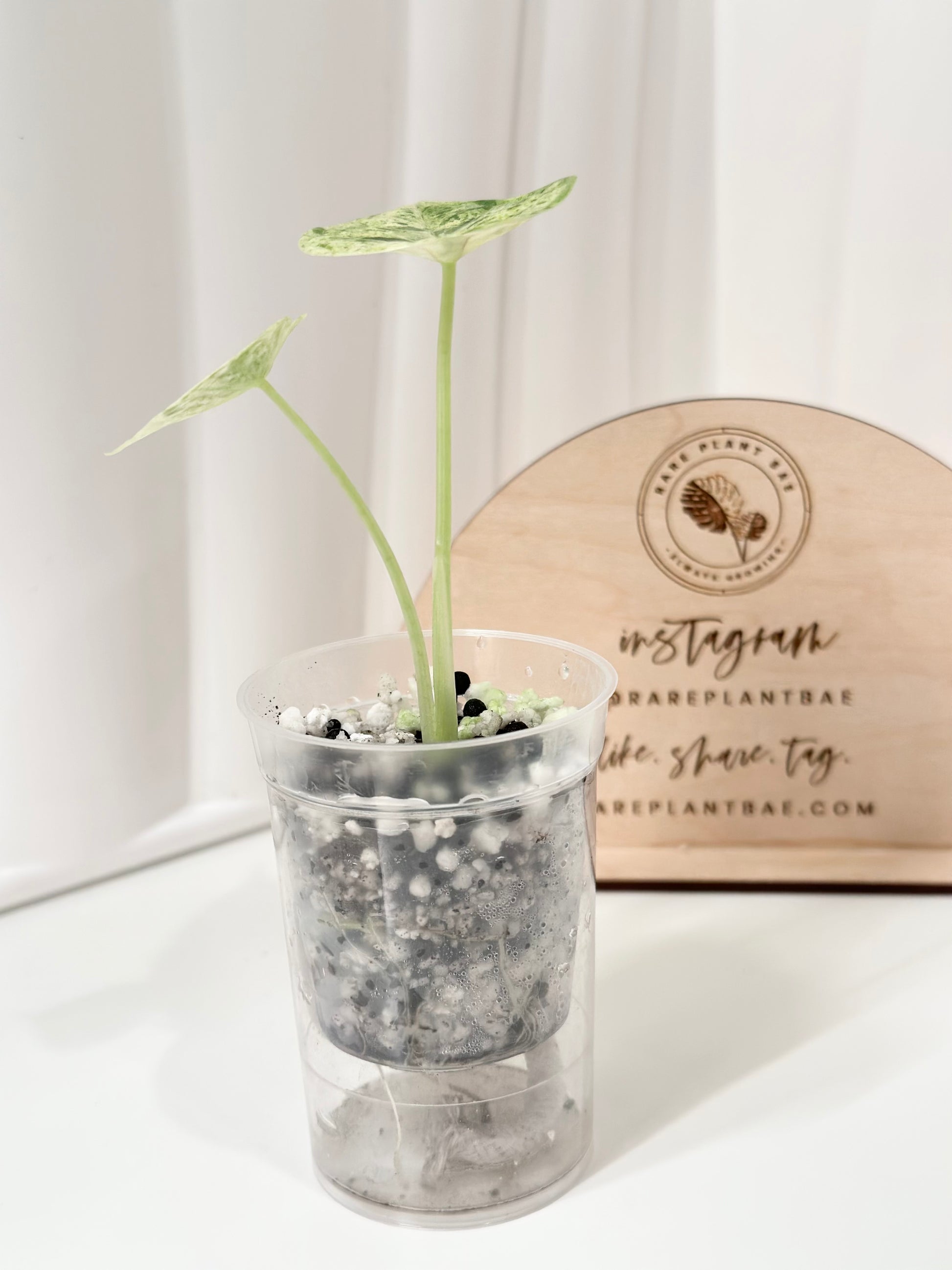 Mature leaves give distinctive mint variegation. The mint green speckles on the leaves allow photosynthesis and thus provide enough energy for the leaves to sustain themselves - even if the leaves seems too albo. (similar characteristic to Monstera Mint)