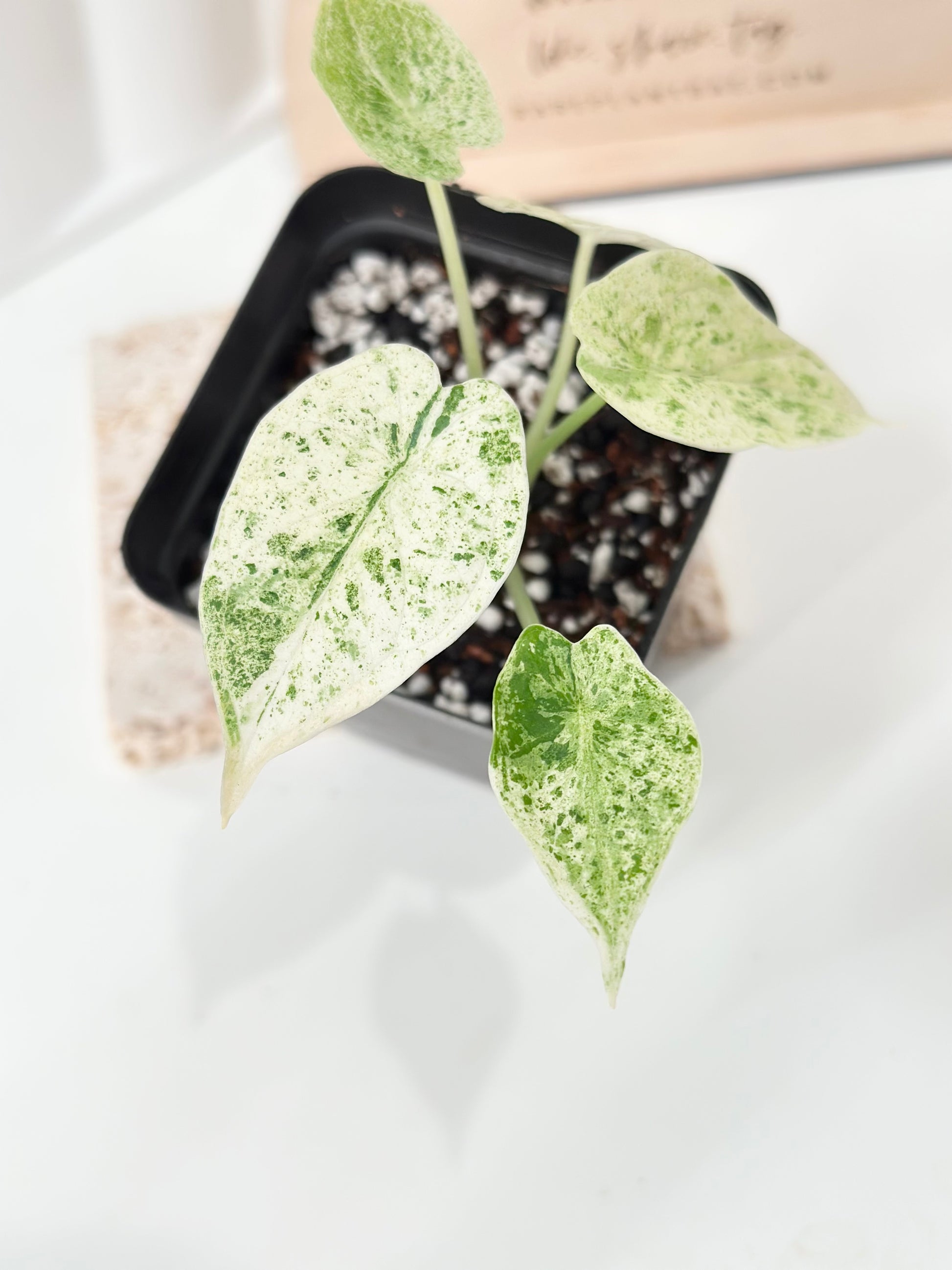 Mature leaves give distinctive mint variegation. The mint green speckles on the leaves allow photosynthesis and thus provide enough energy for the leaves to sustain themselves - even if the leaves seems too albo. (similar characteristic to Monstera Mint)