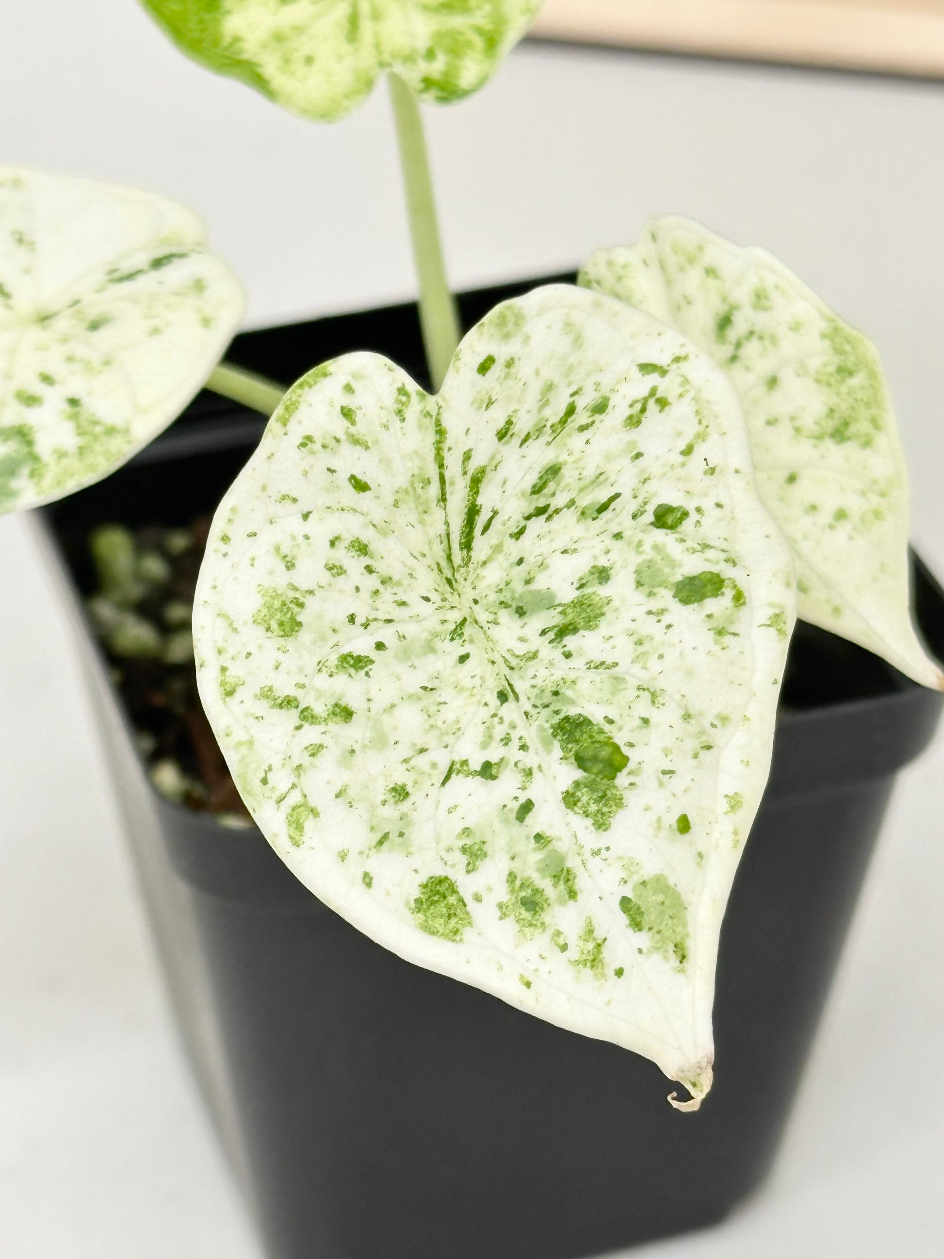 Mature leaves give distinctive mint variegation. The mint green speckles on the leaves allow photosynthesis and thus provide enough energy for the leaves to sustain themselves - even if the leaves seems too albo. (similar characteristic to Monstera Mint)