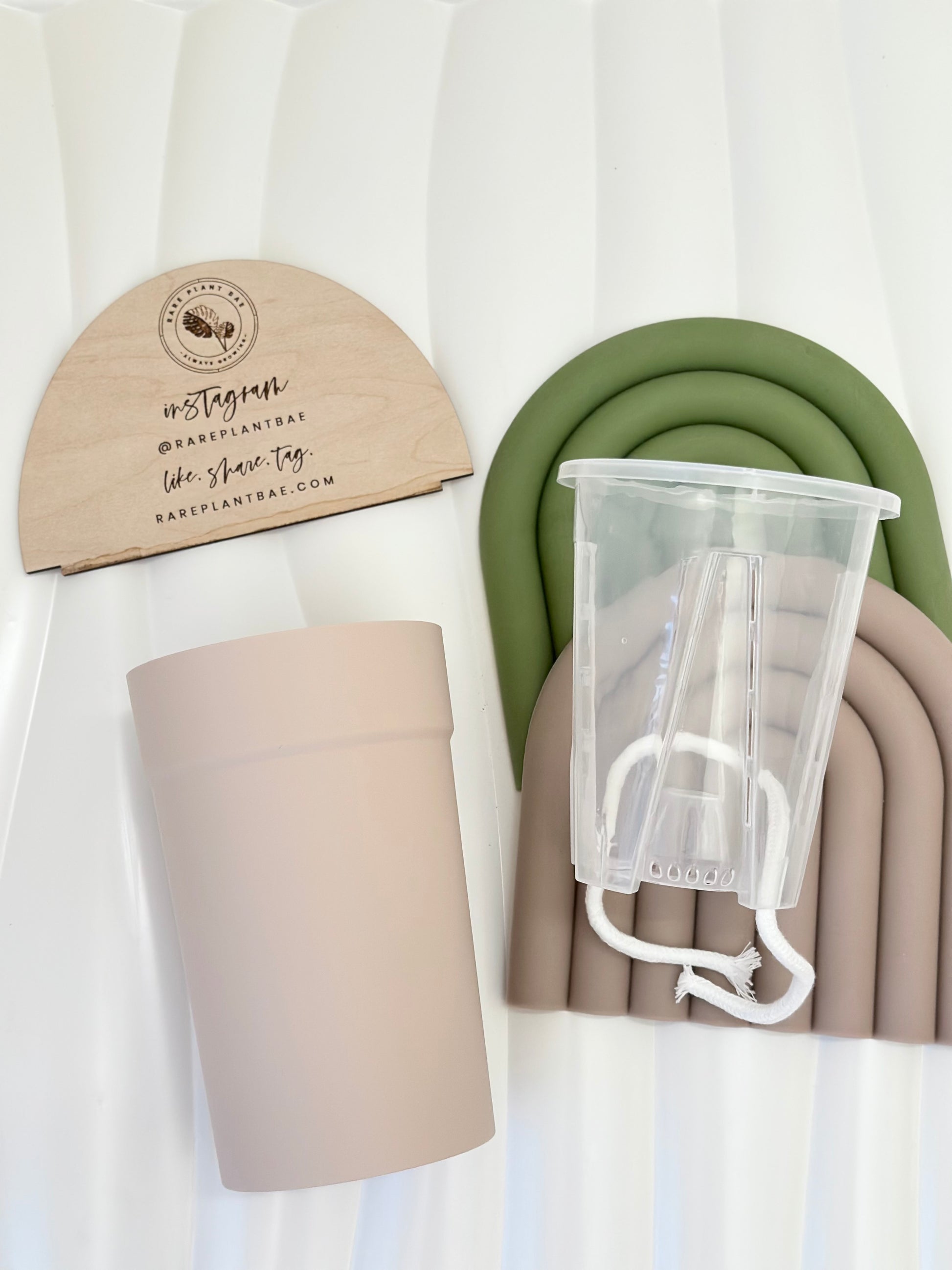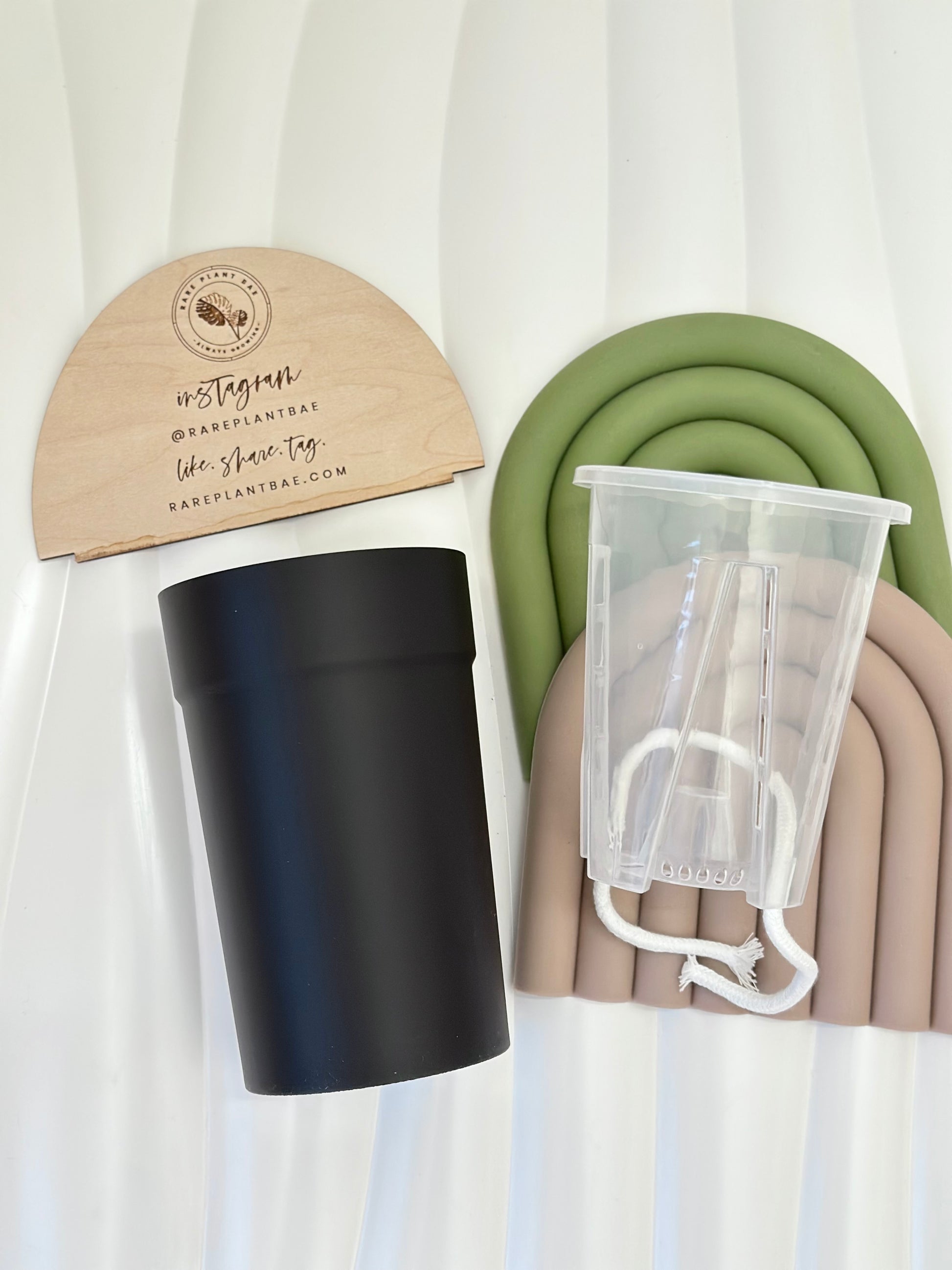 Each full set comes with a customized 3D printed outer pot, a clear nursery pot, and a wicking rope.